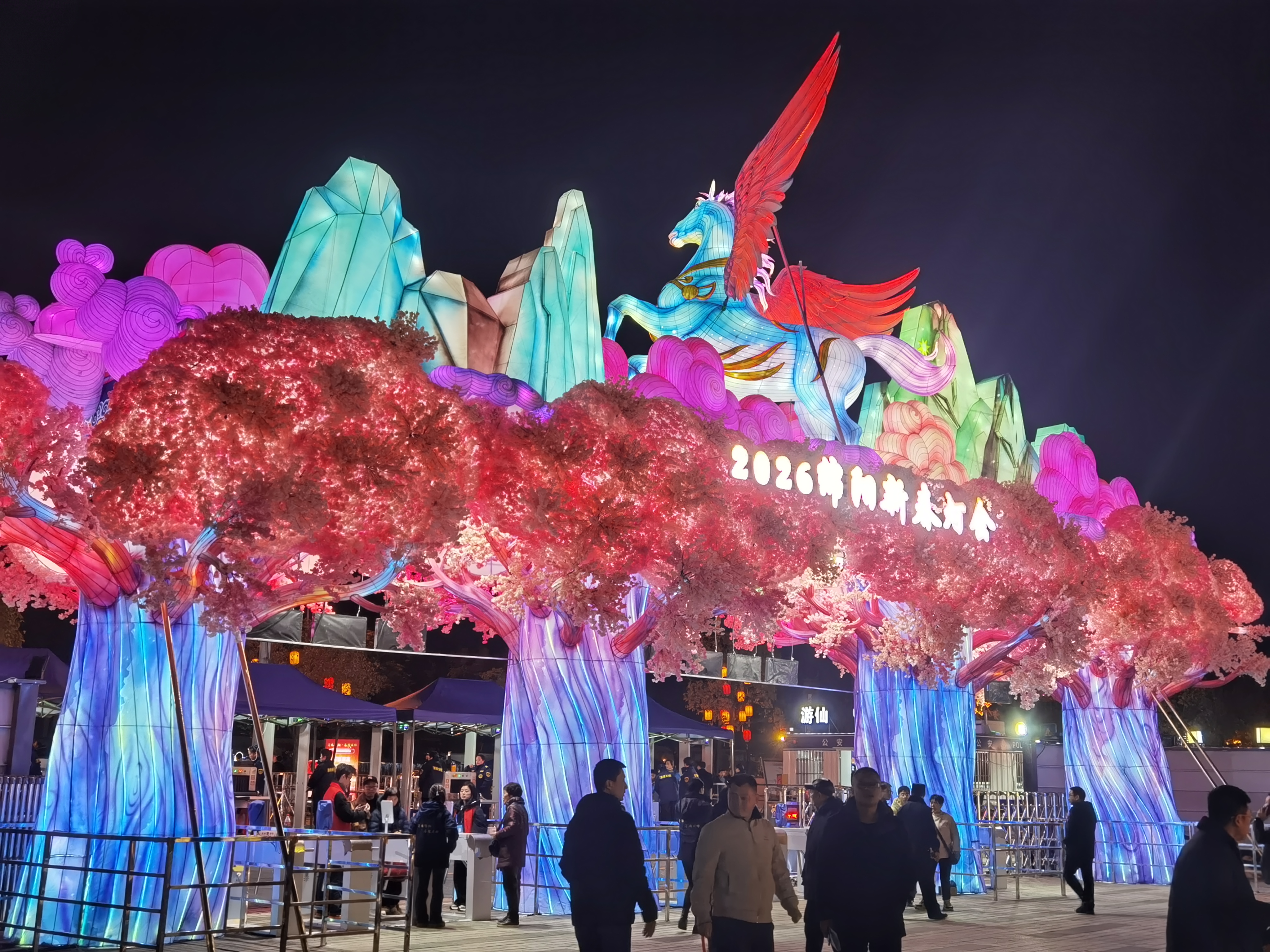 生肖元素的呈现同样匠心独具。天马仙骥大门、徐悲鸿《双骏图》复刻、马年春晚吉祥物等特色灯组星罗棋布,或萌态可掬,或器宇轩昂,承载着人们对新年顺遂、一马当先的美好寄托。
